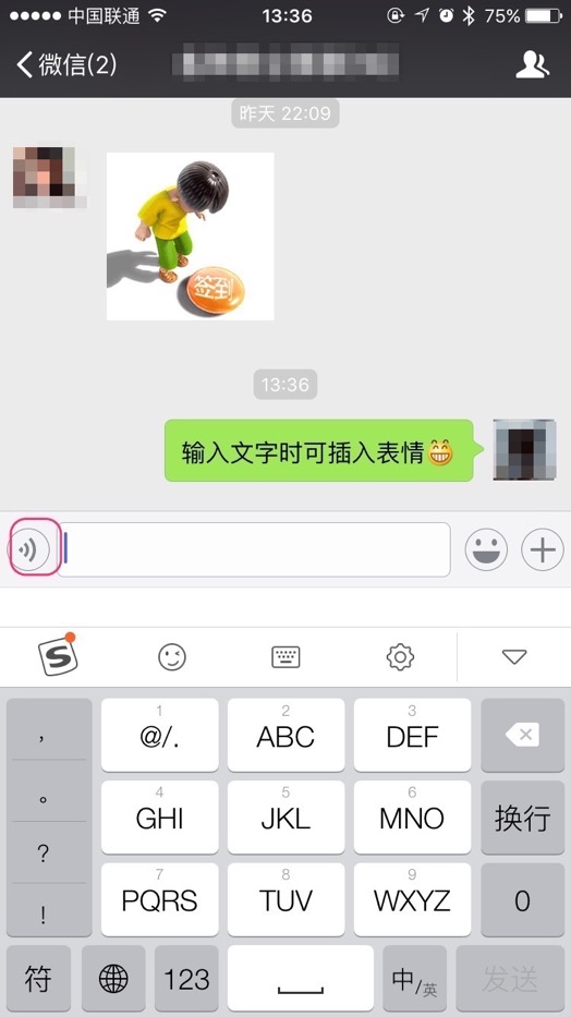 可看到信息已经发给对方了,除了文本信息外还可直接发送语音信息,点屏幕左侧红色线框圈中的按钮即可进入语音发送界面。