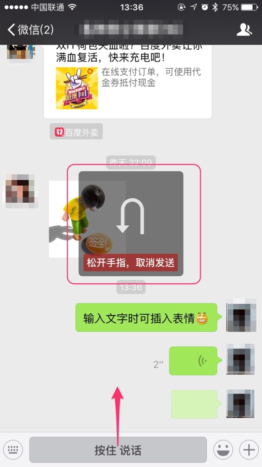 如果您想中途取消拍摄,请在不松开手指的情况下向上滑动,直至屏幕中出现红色的“松手取消”字样,松开手指,即可取消拍摄,之前拍摄的内容也不会发出。