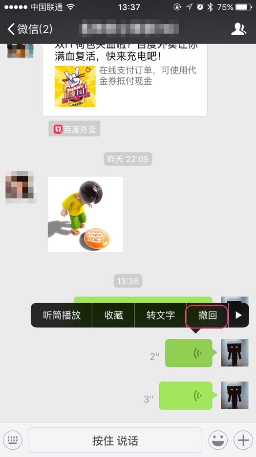 有时您可能会想撤销已经发送的信息,这是您只要按住要取消信息的绿色方框等待片刻就会显示一个黑色的菜单,点里面的“撤回”即可取消该记录。(点右侧的白色箭头可以查看更多菜单,包括“删除”)