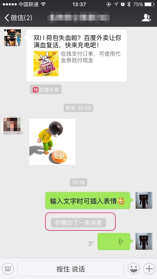 要注意的是如果您使用撤回功能聊天记录中会出现一条“你撤回了一条信息”的字样,同时您的聊天对象也会收到这个提示。