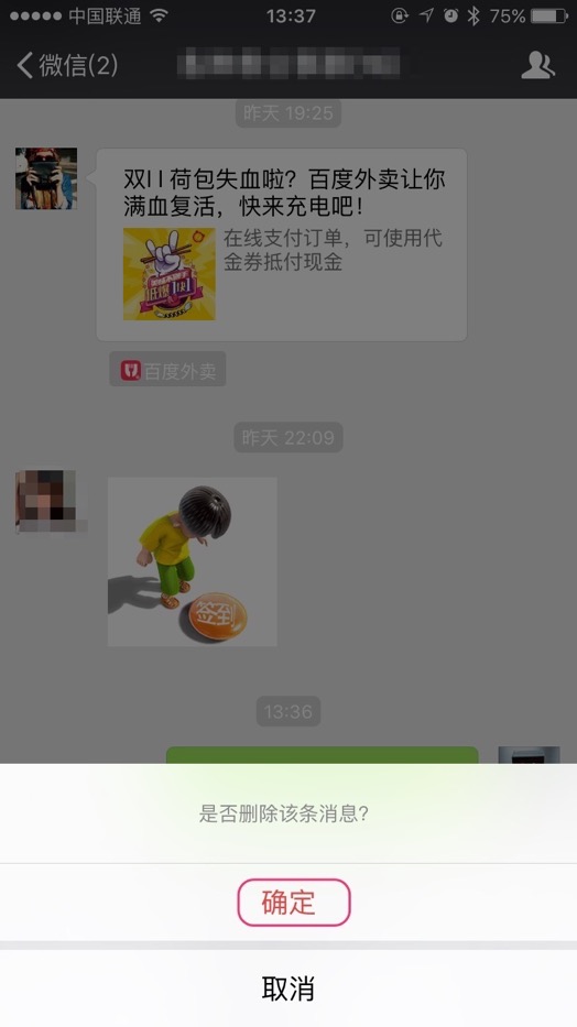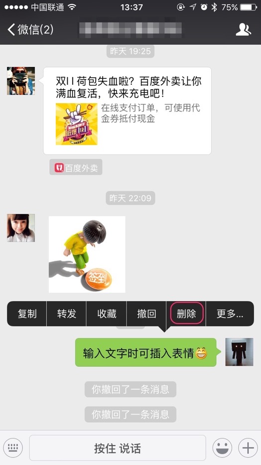 如果您想毫无痕迹的取消某条信息,那么应该使用删除功能,操作方式一样,按住要删除的信息,等黑色菜单出现后点“删除”。