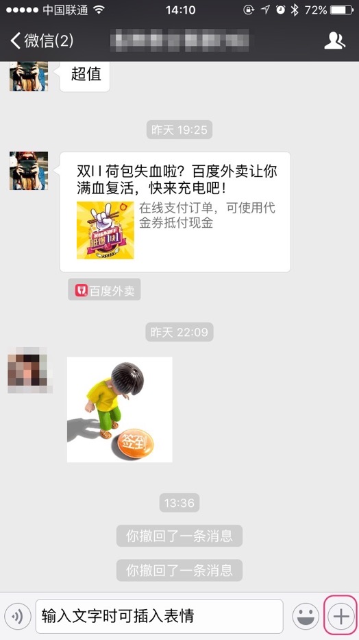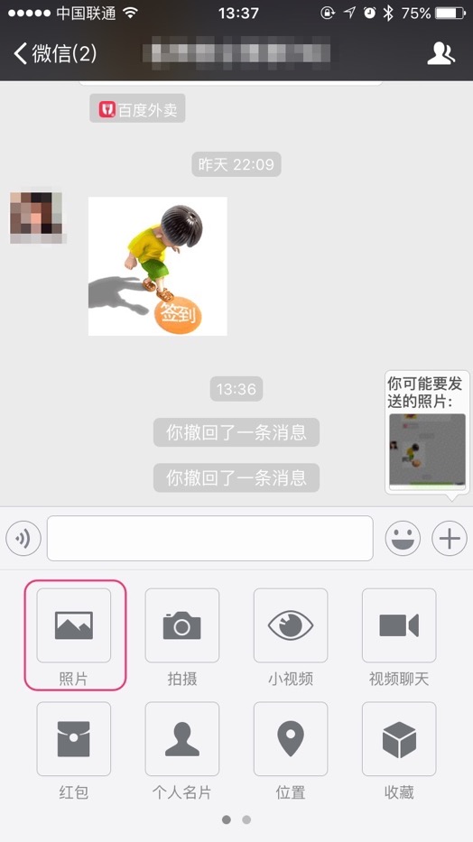 如果您希望将照片或视频发给您朋友,请点击聊天界面右下角的“加号”图标