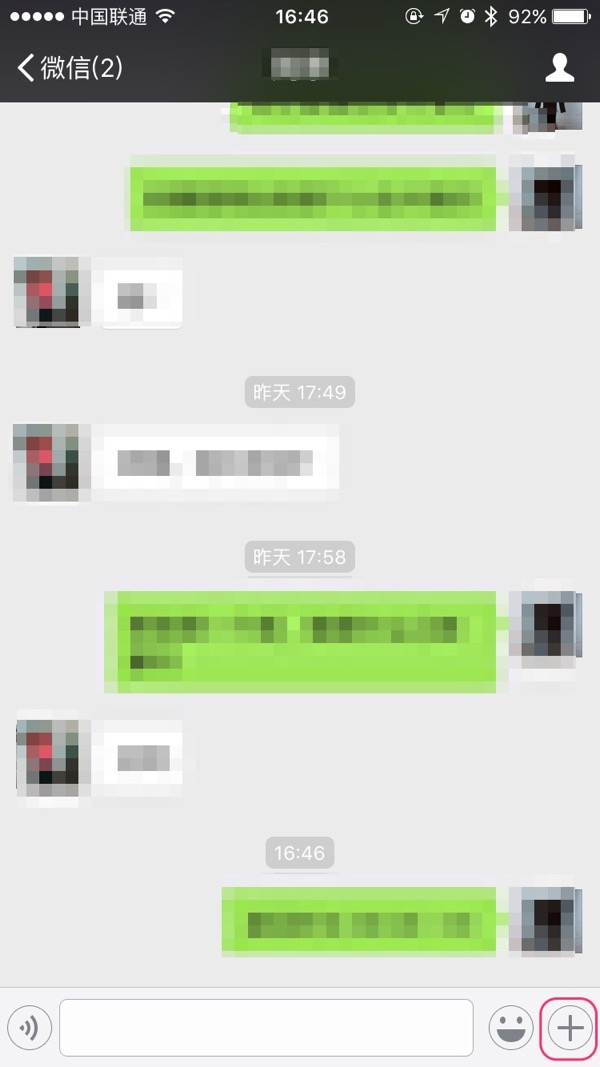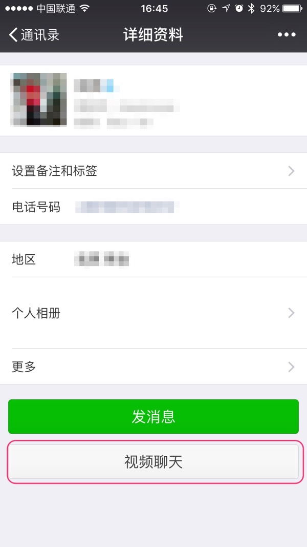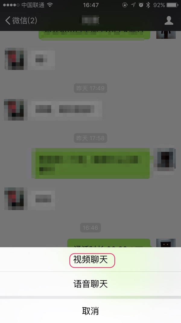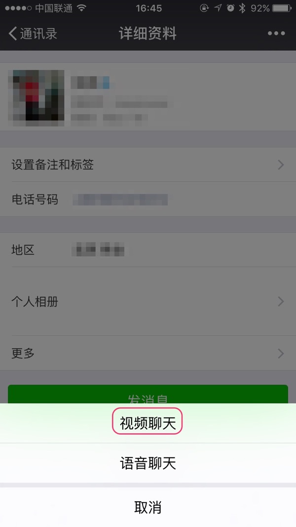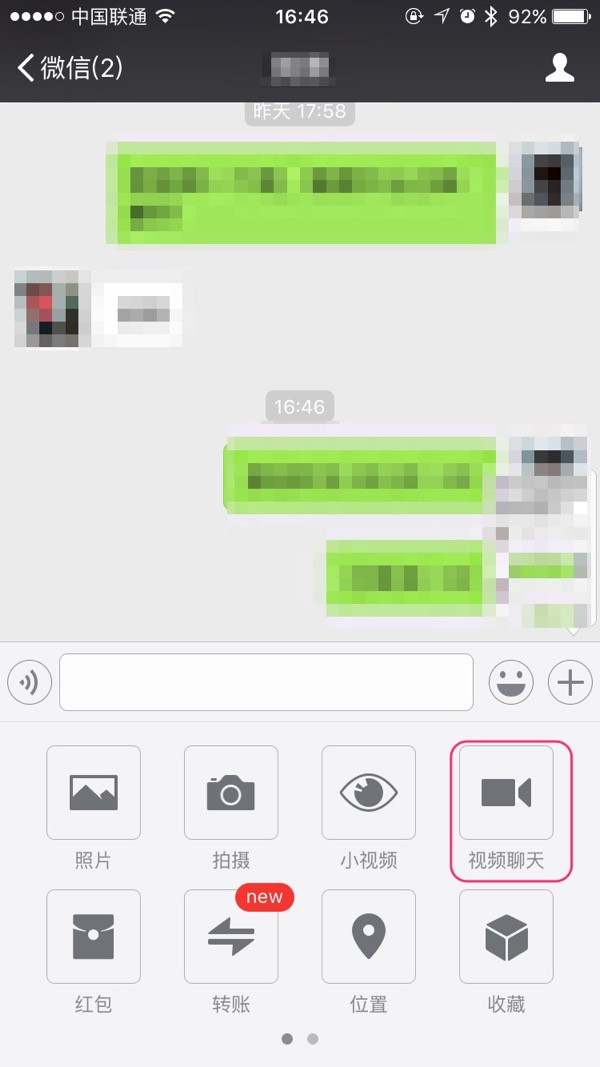 除了通过“通信录”开始视频聊天外,您也可以在常规聊天界面中进入视频聊天,点聊天界面右下角的“加号”图标