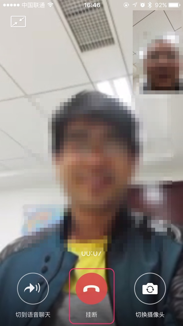 如要挂断视频聊天,请点击屏幕中任意一个区域,这时界面下方会显示三个按钮,点中央红色的“挂断”按钮即可挂断,另外如果您想使用后置摄像头拍摄则可点击右下角的“切换摄像头”按钮。