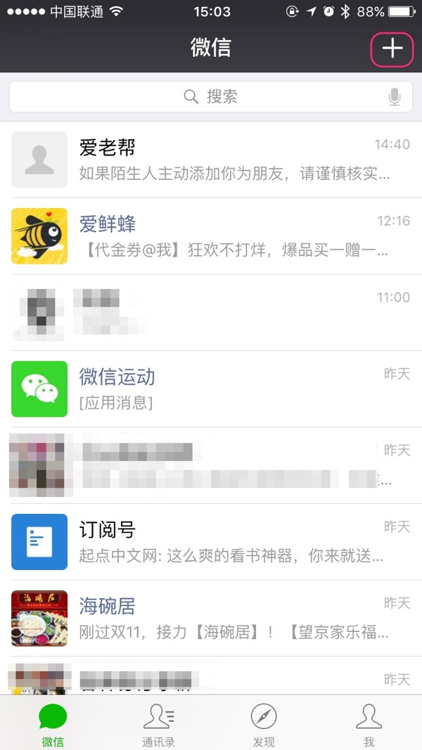 打开微信,然后点屏幕右上角“加号”按钮