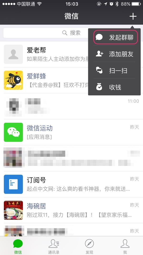 在弹出的菜单中选择“发起群聊”