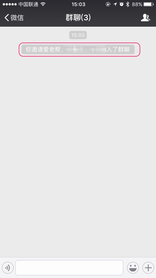 界面会转到群聊窗口,群聊已建立,可以看到聊天界面中第一条信息即是您邀请的朋友名字,群聊与一对一聊天方式方法完全一致。