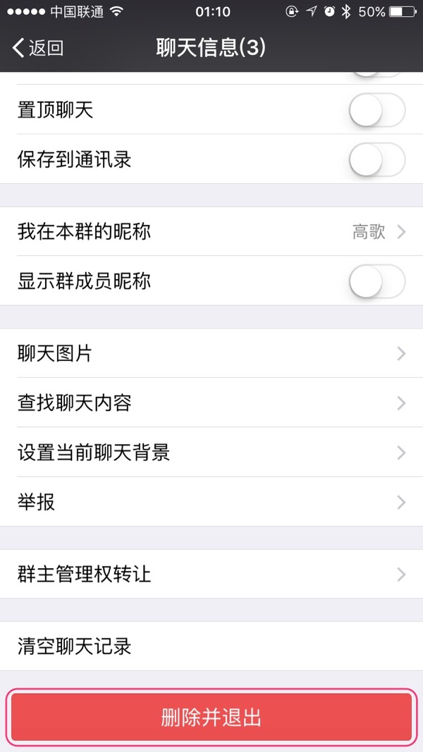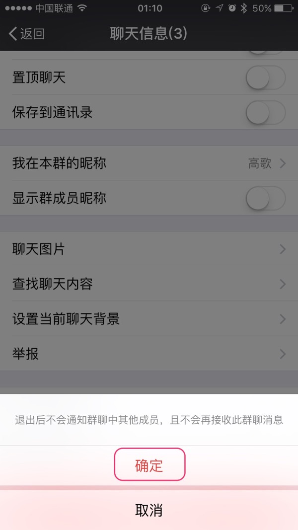 在弹出的提示信息中点“确定”,即可退出群聊