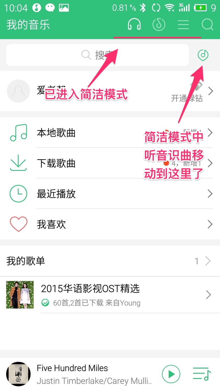 已进入简洁模式,简洁模式中原先顶部的“我、音乐馆、简洁”等字样将变成图标,听音识曲功能按钮将移动到界面右上区域