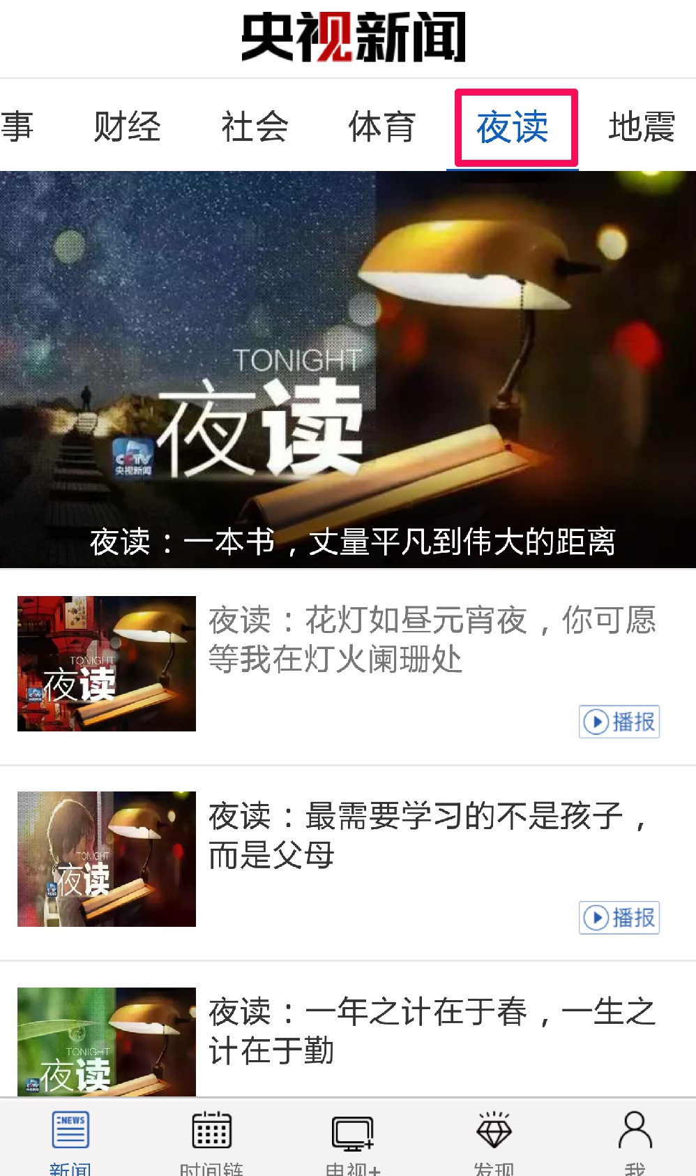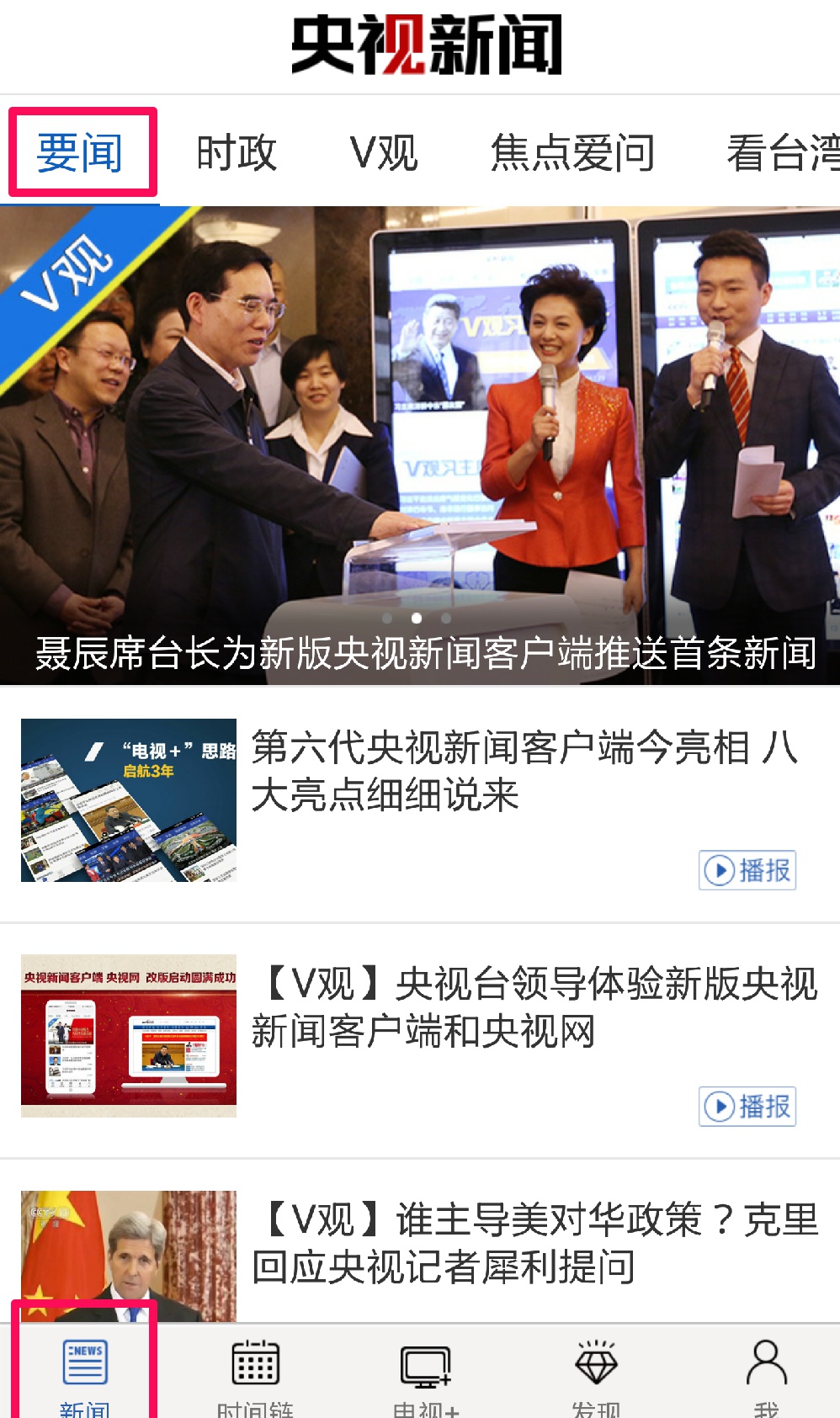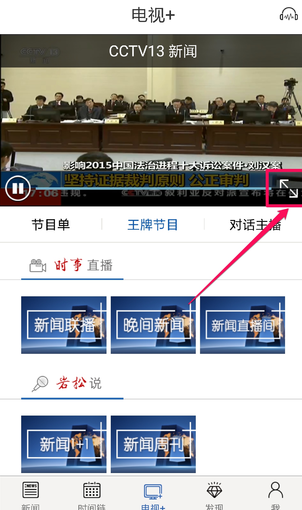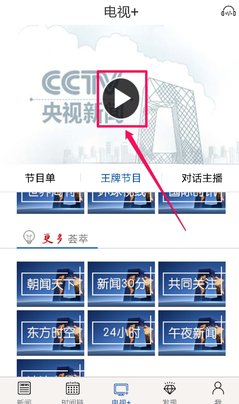 “电视+”是浏览视频新闻的栏目。在这里,您可以选择中央电视台的各频道直播节目,也可以选看其他时间段的以往节目。在下方选好栏目后,点击上面的播放按钮,即可开始看电视