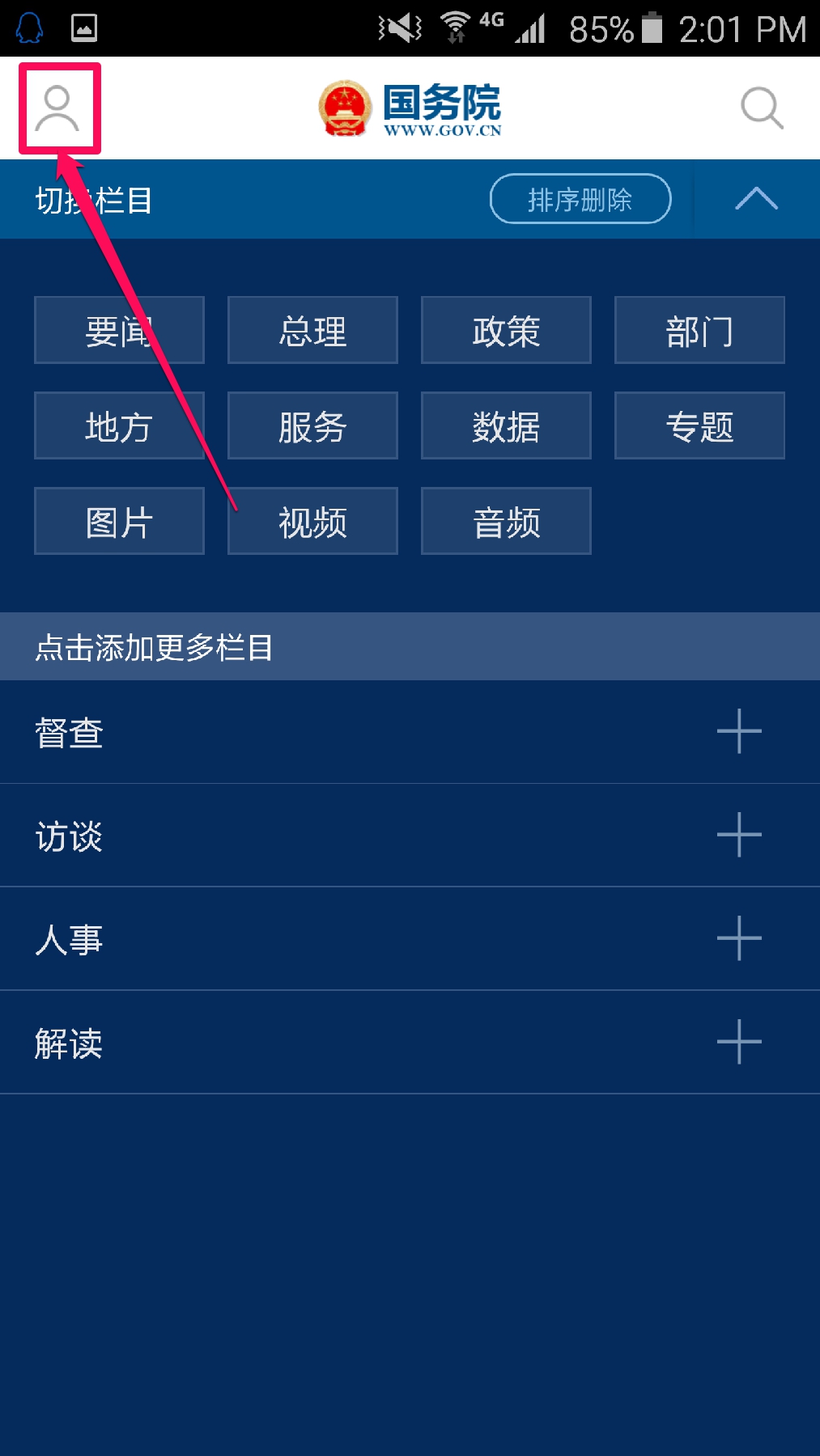 点击右上角的下箭头图标,进入栏目管理页面。在这里,点击“排序删除”,可以对首页的各子分类进行排序,或删除使其不出现在您的首页上