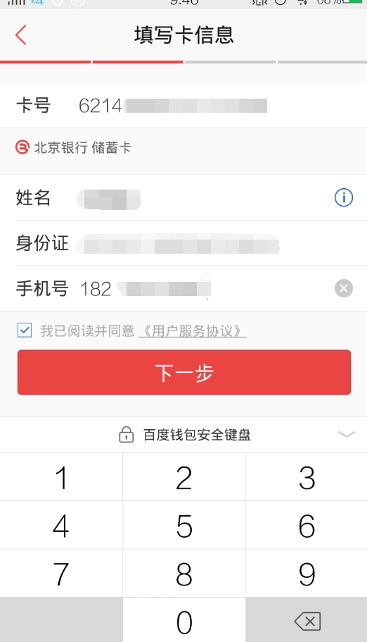 填写卡信息,包括姓名、身份证号、手机号,选择“我已阅读并同意《用户服务协议》”,进入下一步