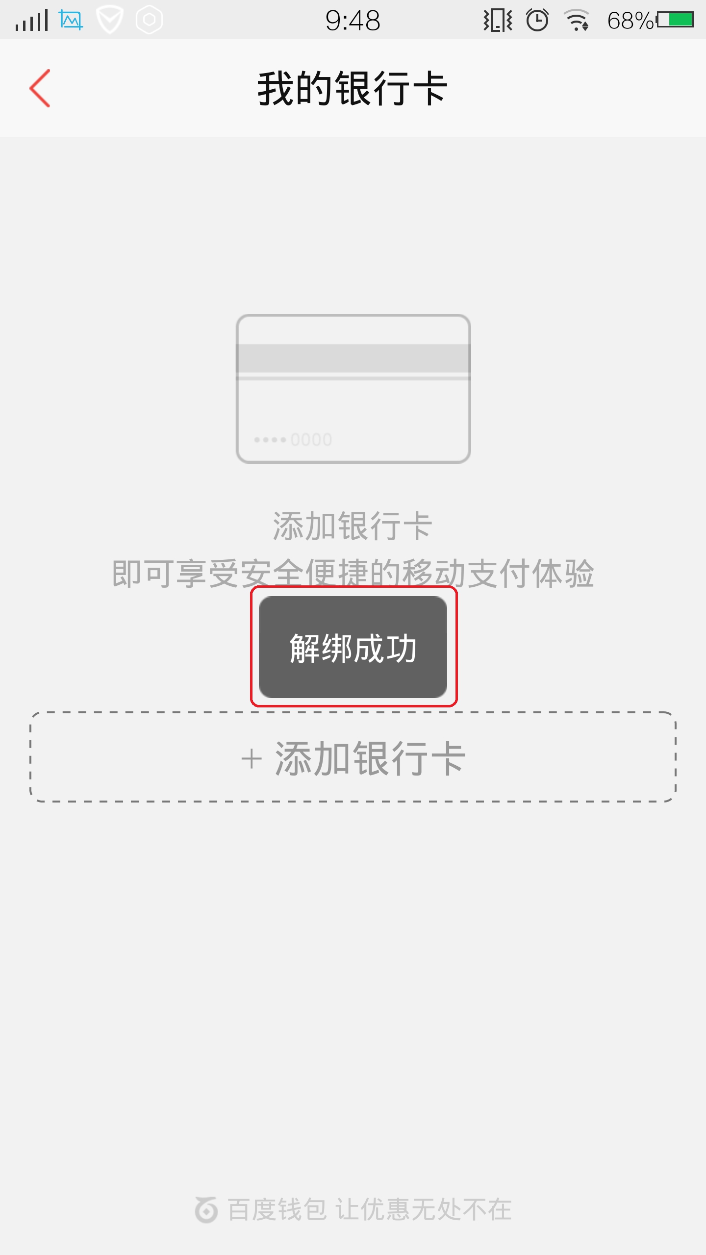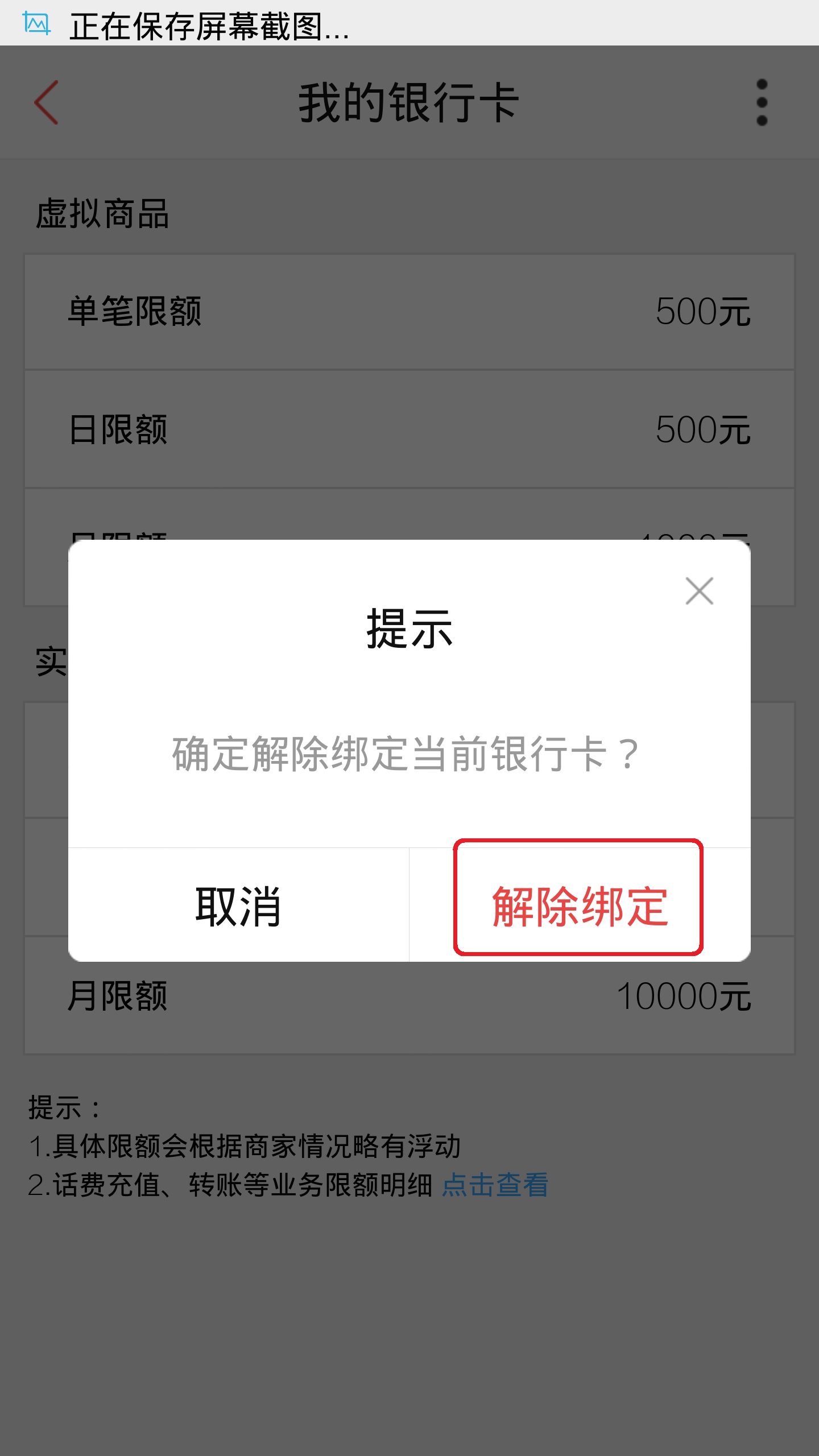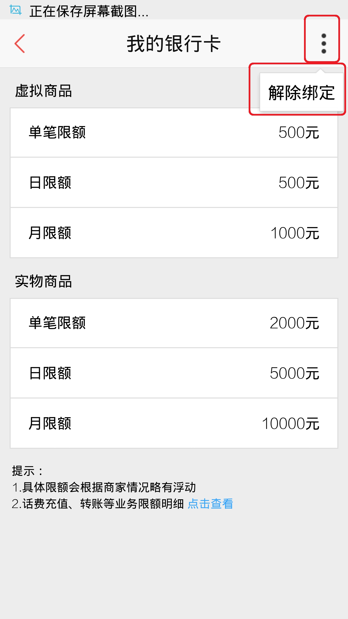 在“我的”-"银行卡"管理界面,点击右上角的三个圆点,会出现“解除绑定”四个字