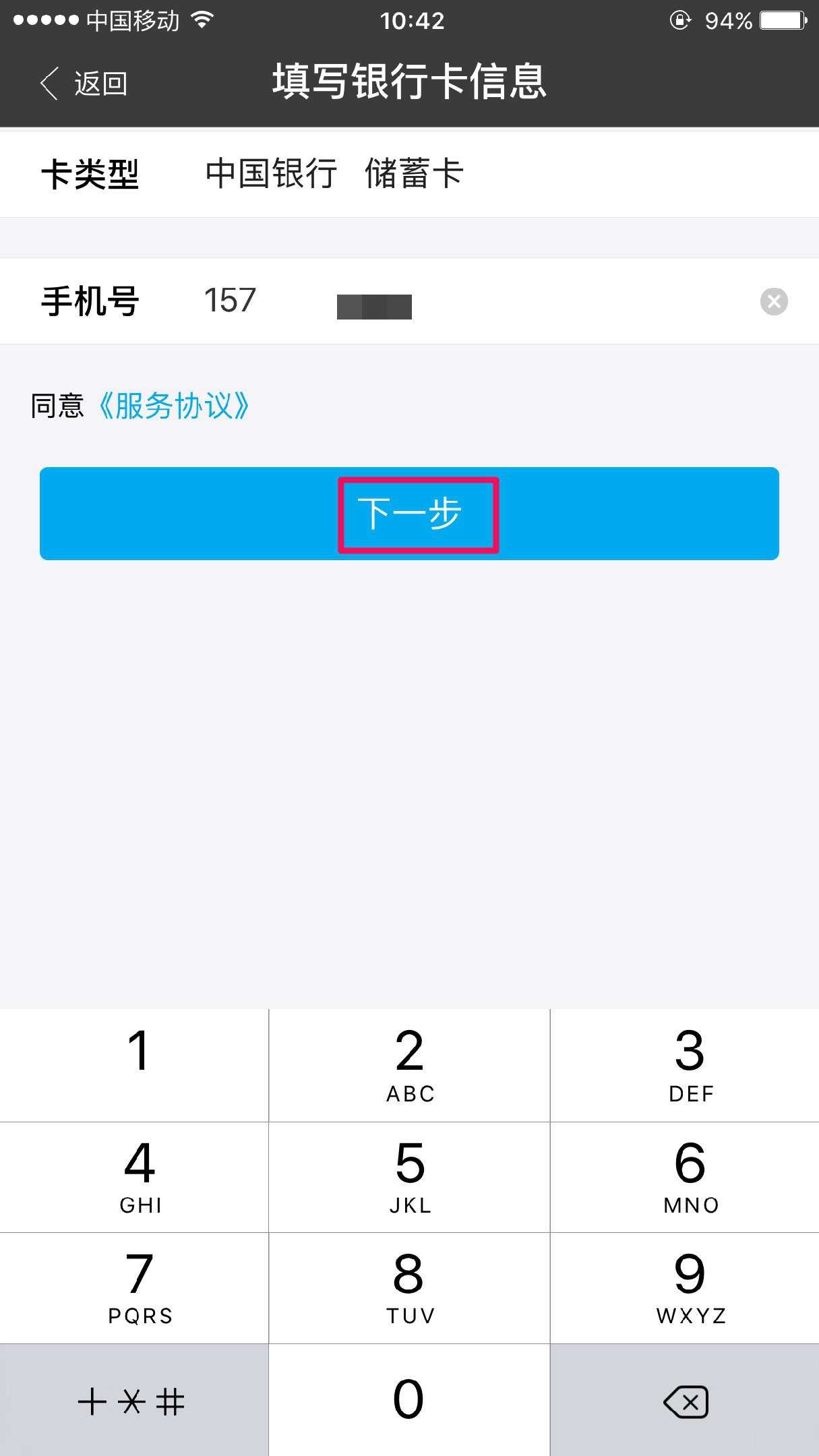 跳转到如下页面,填写储蓄卡类型与该银行卡在银行预留手机号