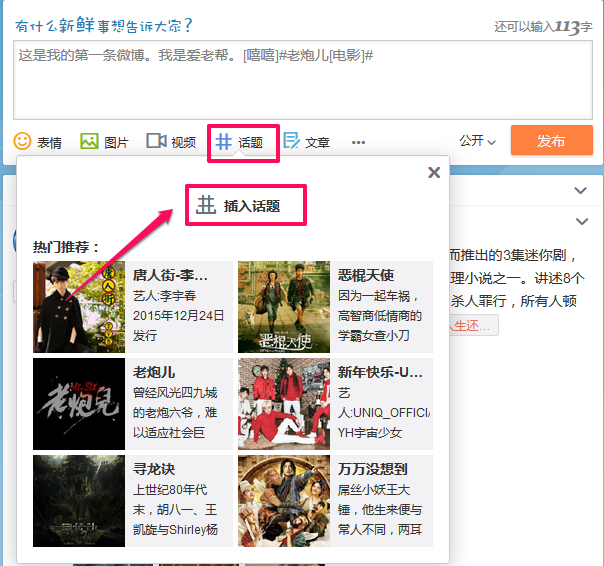 可以为您发布的微博加上一个话题,这样能被更多关注该话题的用户搜索到。点击输入框下方的话题按钮,选择列表内与您发布的微博内容相一致的话题,或者自己编写一个合适的话题