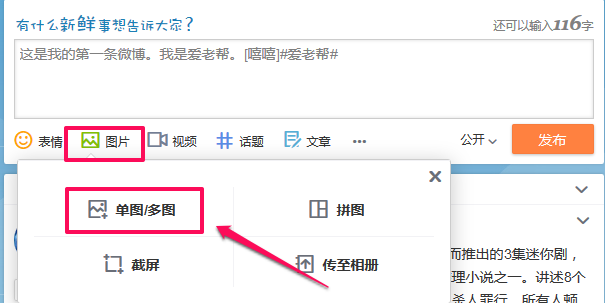 除了可以发布文字+图片的微博,您还可以单独发布图片微博或单独发布文字微博