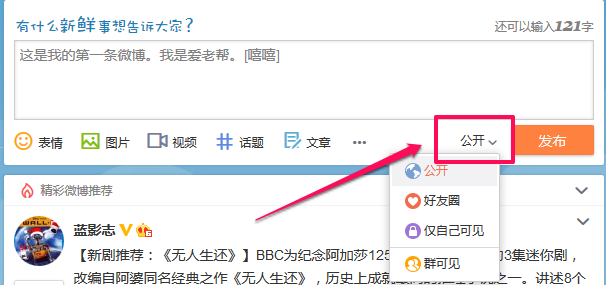 不同于发布微信朋友圈只能被您的好友看到,您发布的微博可以被任何人看到。修改微博的公开权限,请点击输入框右下角的“公开”按钮。有一些内容如果只分享给与您互相关注的好友,请选择“好友圈”。如果只想给自己看,请选择“仅自己可见”。如果您加入了微博群,可以选择只分享给您的群友看,这需要点击“群可见”。设置完毕,请点击“发布”,一条微博就成功发出了