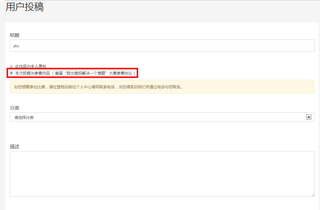 依次填写:稿件的标题,勾选是否原创,选择是否参加“我为爸妈解决一个难题”大赛(请阅读参赛协议),选择作品分类,并用一句话描述作品。