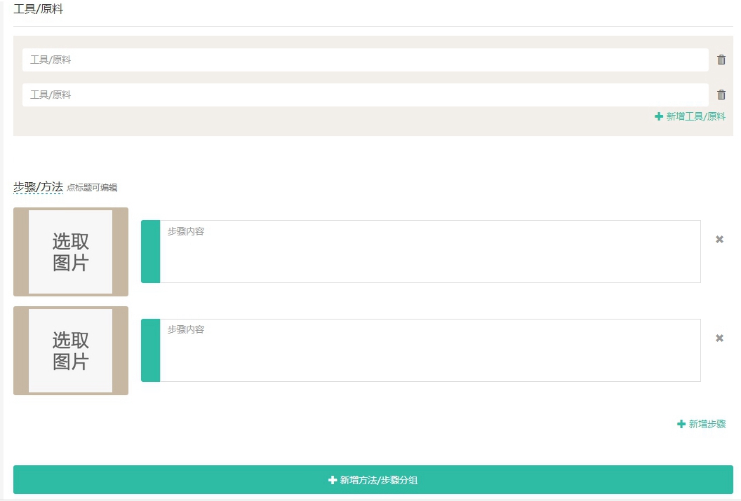 依次填写:所需工具或原料,步骤方法(一图一步骤),新增方法或步骤组。 其中,所需工具或原料、新增方法或步骤组是选填项。
