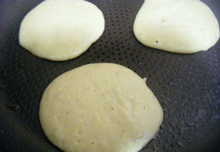 平 底锅刷上一层薄油,小火倒入蛋面糊铺平锅底